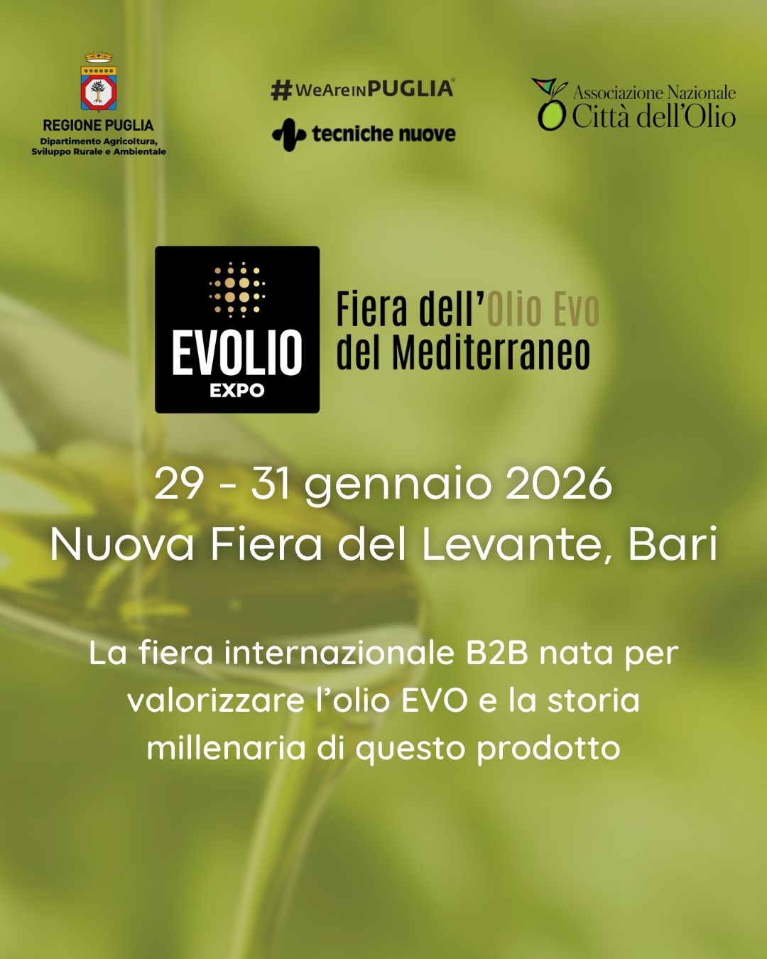 Dal 29 al 31 gennaio 2026 si terrà la seconda edizione di EVOLIO Expo con la partecipazione del Comune di Bitonto e della sua Comunità dell’Olio. La fiera è il riferimento per il settore